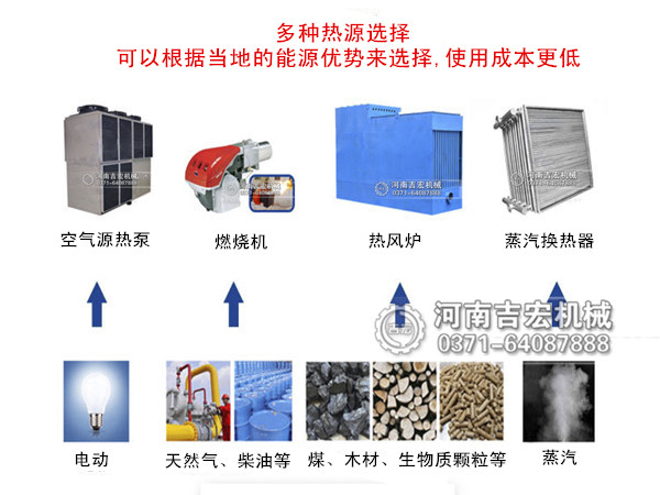 加熱方式:熱源方式可以選燃煤熱風(fēng)爐、電能、天然氣、熱泵、生物質(zhì)顆粒。
