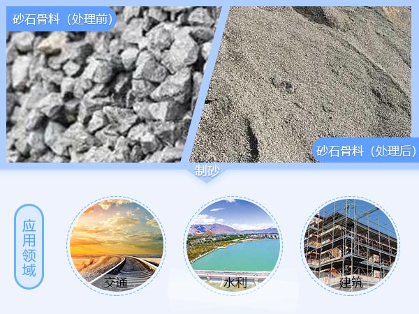 我國礦產(chǎn)資源豐富,許多山上開采下來的石料都可加工成沙子,能夠替代天然砂成為建筑、公路等領域的主要用砂。像鵝卵石、河卵石、青石、石灰石、石英石等等,這些石料在自然中存量非常大,本身其用途并不大,但是經(jīng)過加工,制成人工砂,其使用價值就得到了提高。石料制砂一般要經(jīng)過粗破、制砂、篩分、洗選等幾步作業(yè)流程。其工藝流程大概是這樣的:首先,石料由顎式破碎機進行初步破碎,然后破碎成的的粗料由膠帶輸送機輸送至對輥制砂機進行細碎,細碎后的石料進振動篩篩分出兩種石子,滿足制砂機進料粒度的石子進制砂機制砂,另一部分返料進細破。進對輥制砂機的石料一部分制成砂,經(jīng)洗砂機(可選)清洗后制成成品砂,另一部分進制砂機再次破碎。整條石料制砂生產(chǎn)線設備主要由振動給料機、鄂式破碎機、對輥制砂機、振動篩、洗砂機、皮帶輸送機等設備組成。