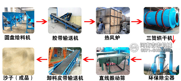 石英砂先經(jīng)過圓盤給料機(jī)被均勻地送入到皮帶輸送機(jī)之上,之后通過流沙管進(jìn)入到烘干機(jī)內(nèi)部,熱風(fēng)爐內(nèi)燃料的燃燒產(chǎn)生的熱量在抽風(fēng)機(jī)的作用下進(jìn)入到主機(jī)內(nèi)與沙子進(jìn)行接觸,完成熱量的傳遞,快速蒸發(fā)水分。我公司生產(chǎn)的沙子烘干機(jī)是三回程密封結(jié)構(gòu),能夠很好的降低熱量的散失,提高熱效率。干燥之后的沙子輸送到直線振動(dòng)篩進(jìn)行篩分,之后被提升機(jī)送入儲(chǔ)料罐進(jìn)行儲(chǔ)存或者進(jìn)行打包裝袋。在接料斗的上部是排放工藝流程之中的塵土等,經(jīng)過除塵系統(tǒng)處理之后,能夠很好的達(dá)到環(huán)保的目的。